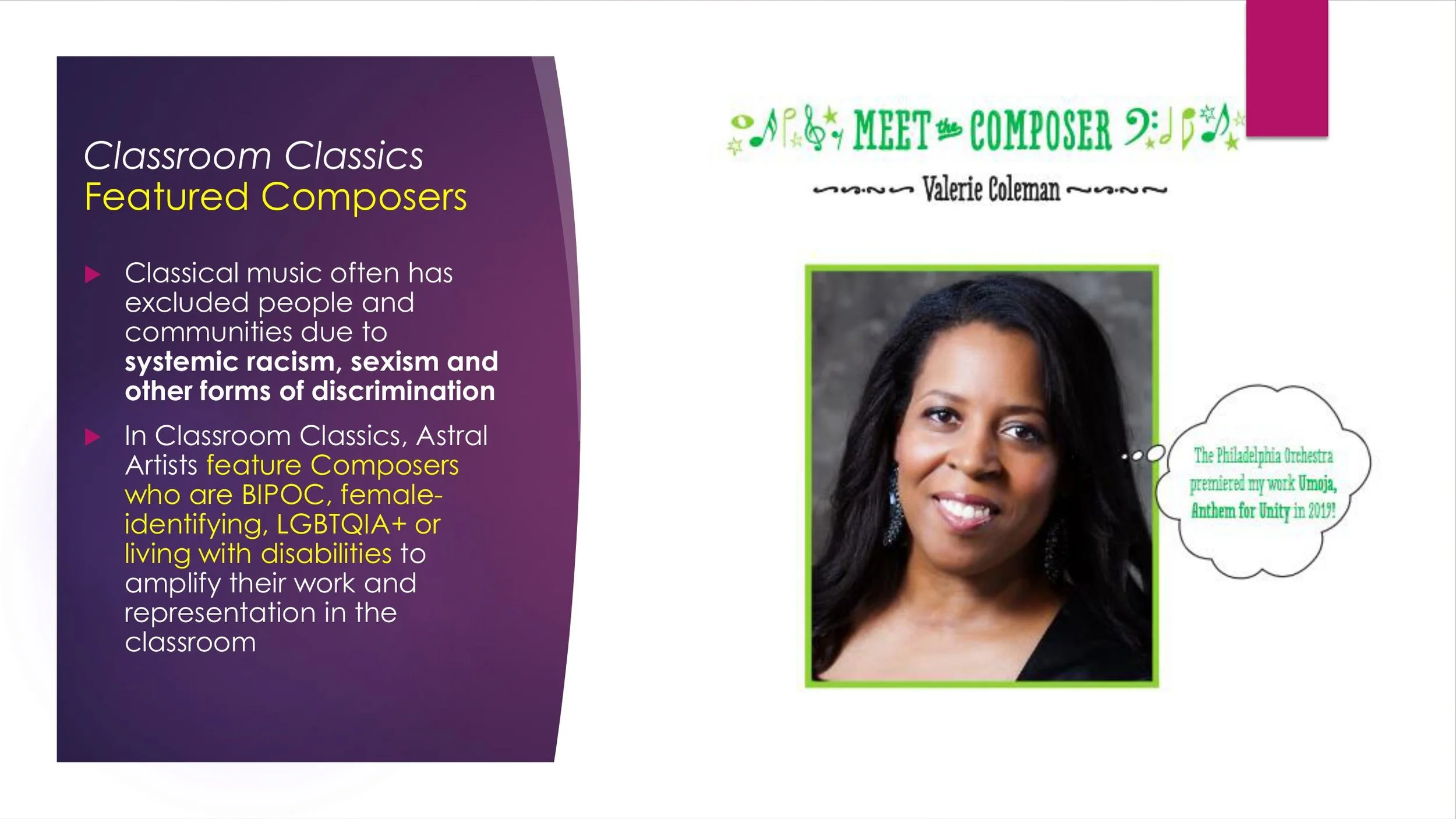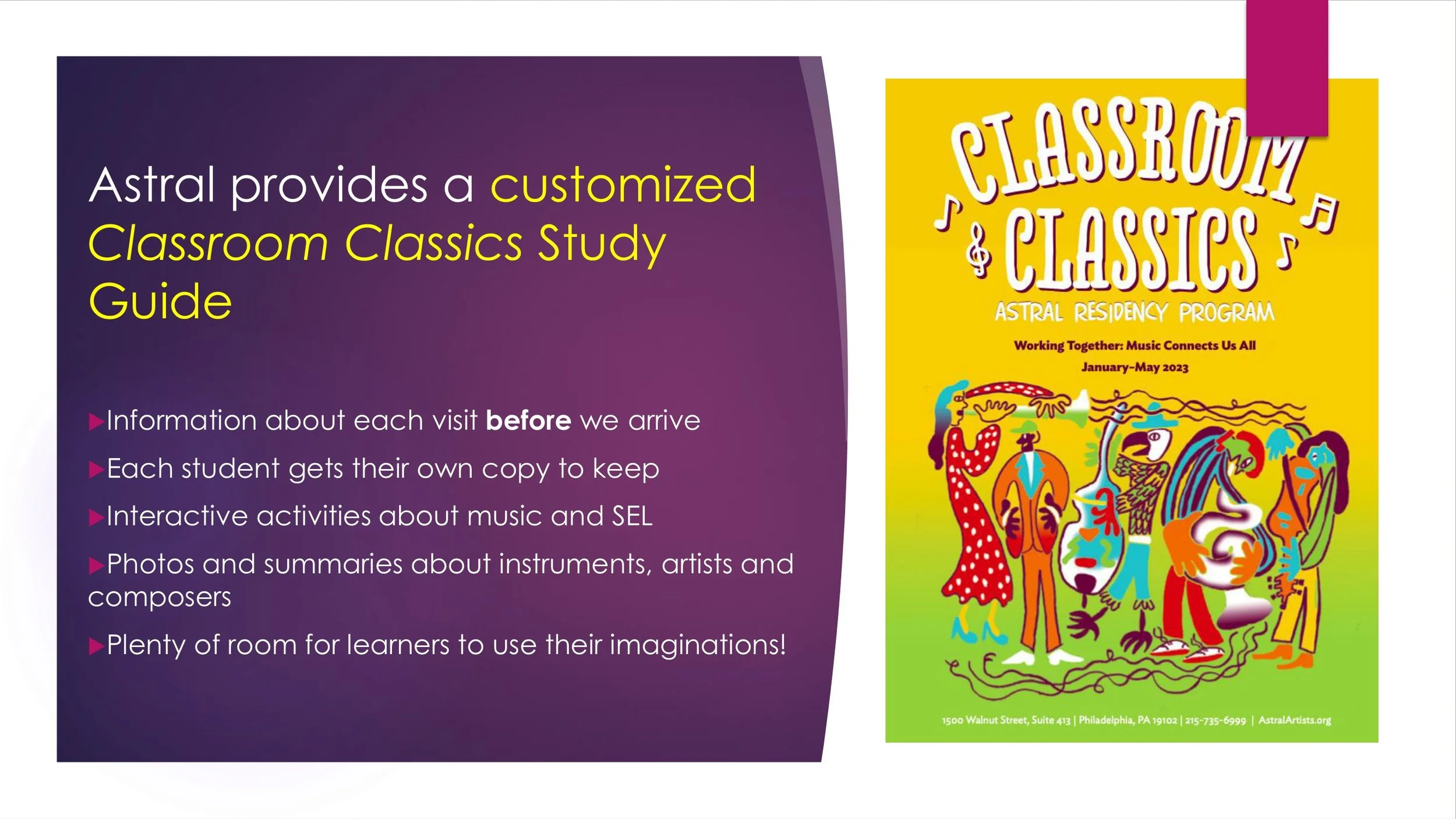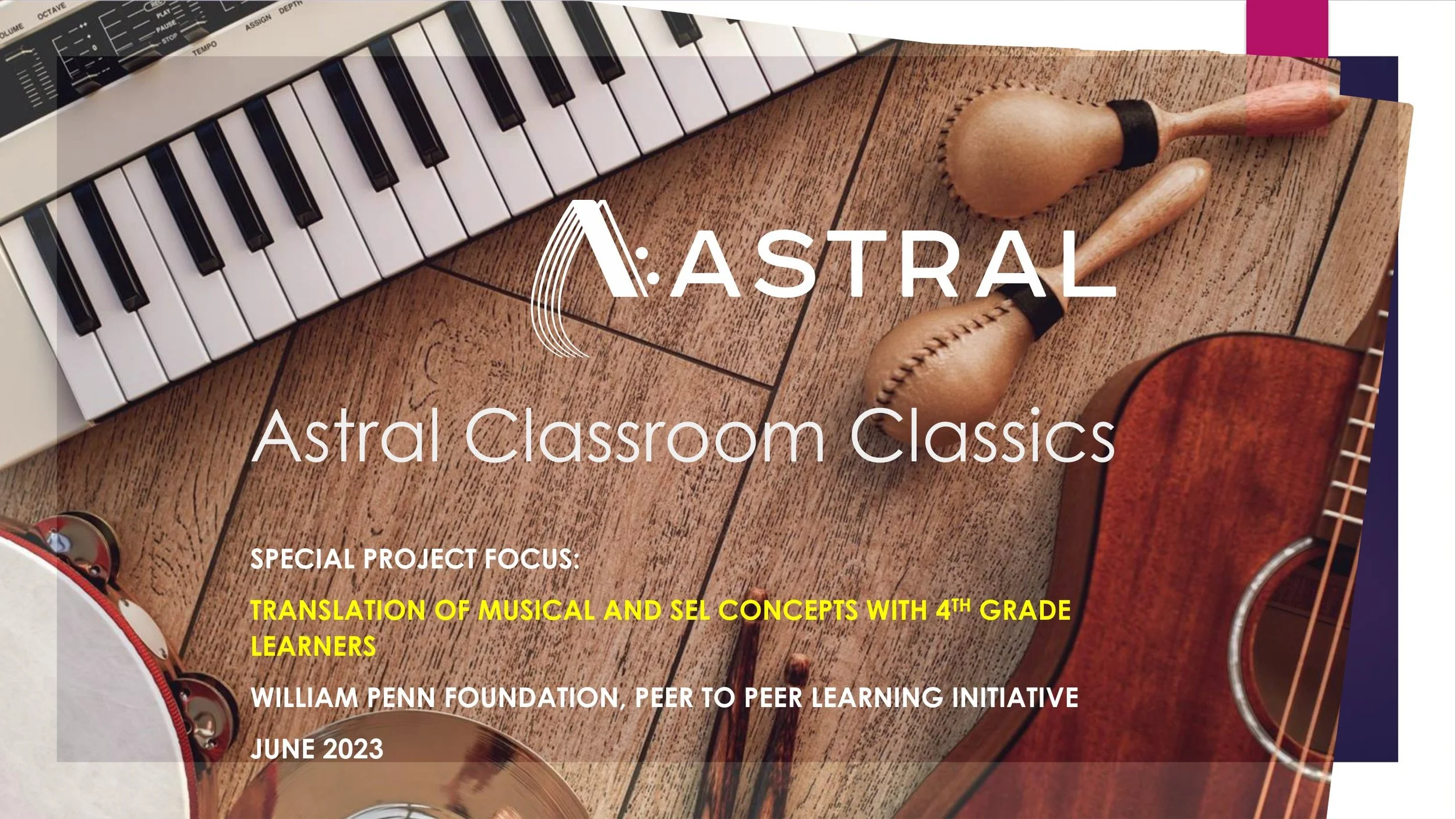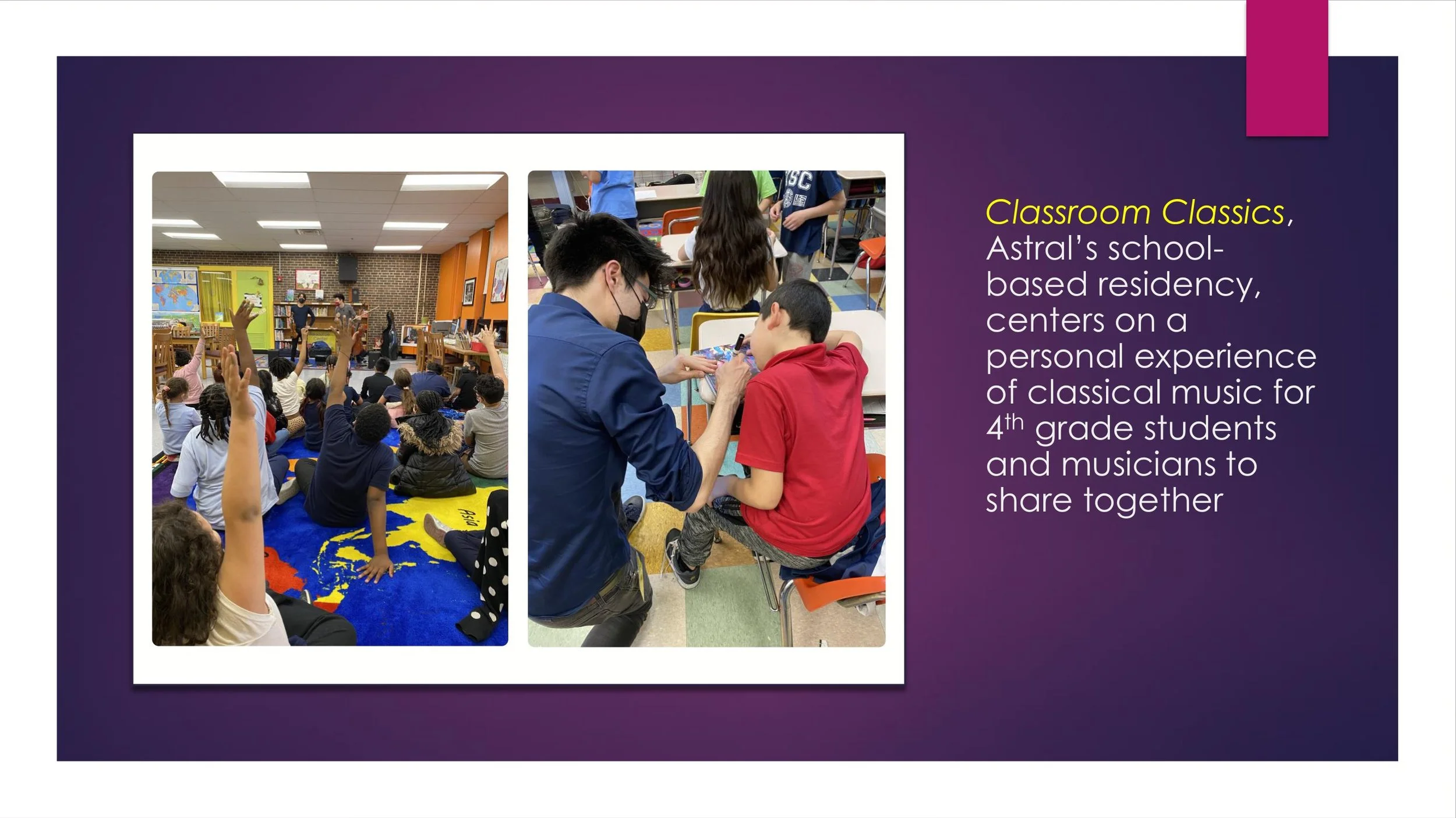 “Classroom Classics, Astral's school-based residency, is centered on a personal experience of classical music for students and musicians to share together. Astral Artists work to translate complex musical and interpersonal skills into language and examples that resonate with students. This translation centers on simplifying, not diluting, understanding of the musical and SEL skills. Astral's approach is centered in curiosity and building connections to music in ways that are authentic and engaging. We are enthusiastic learners and look forward to sharing knowledge and learning together. We are also aware of the systemic biases that impact who is seen in the arts, particularly classical music, and actively work to knock down these "false walls" by amplifying the voices of composers and artists of color, those who identify as female or trans, and those living with disabilities. “