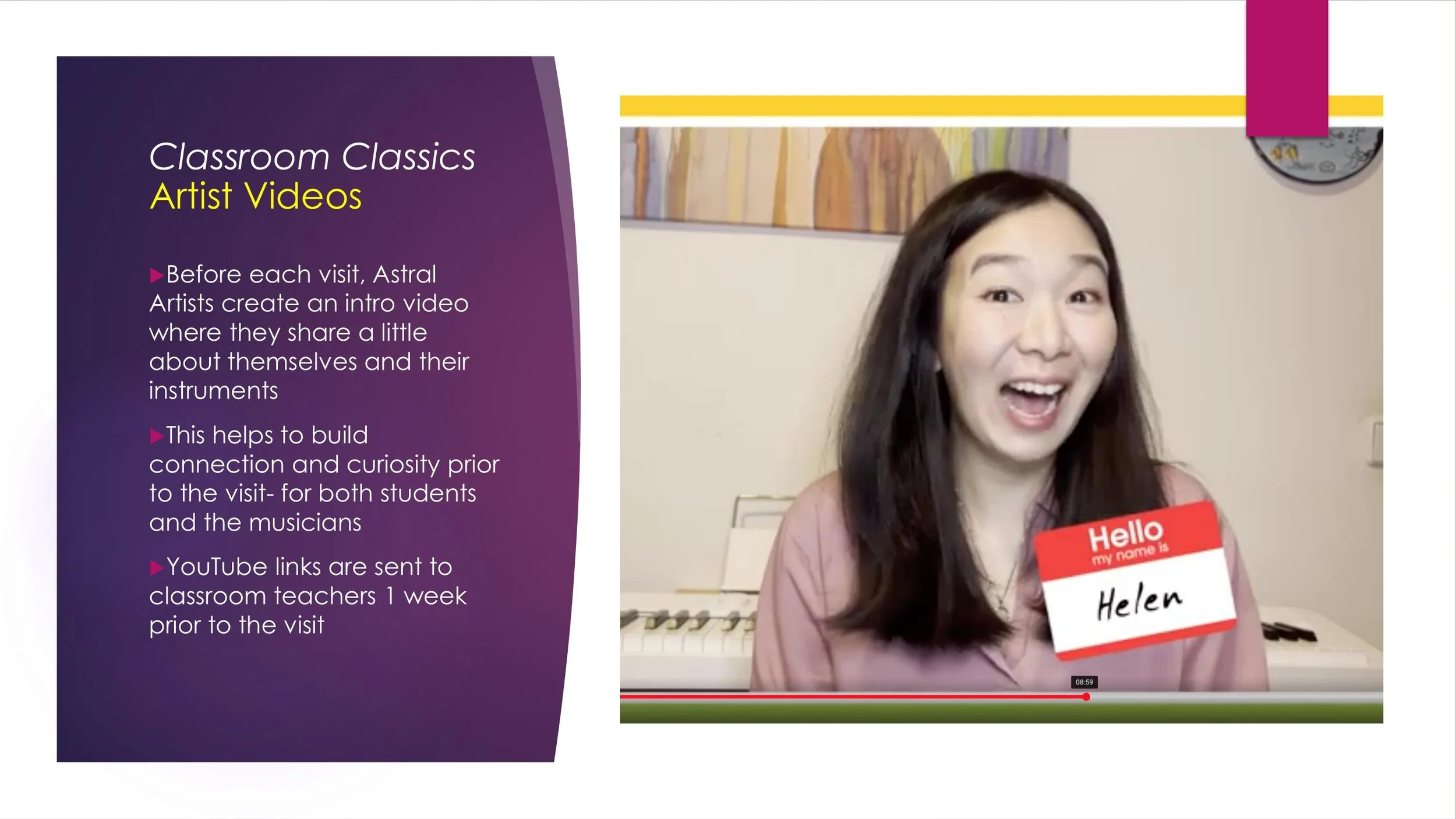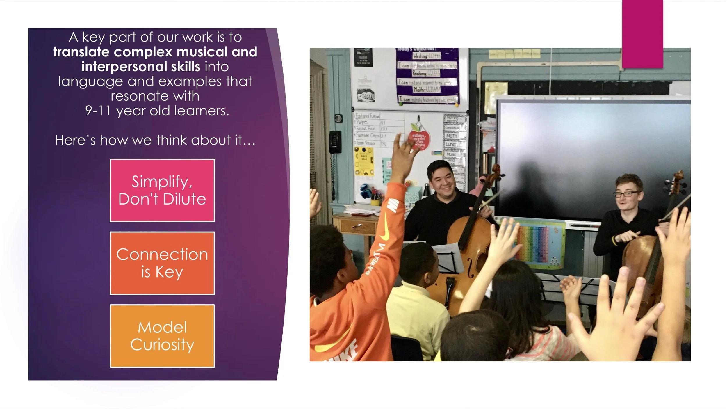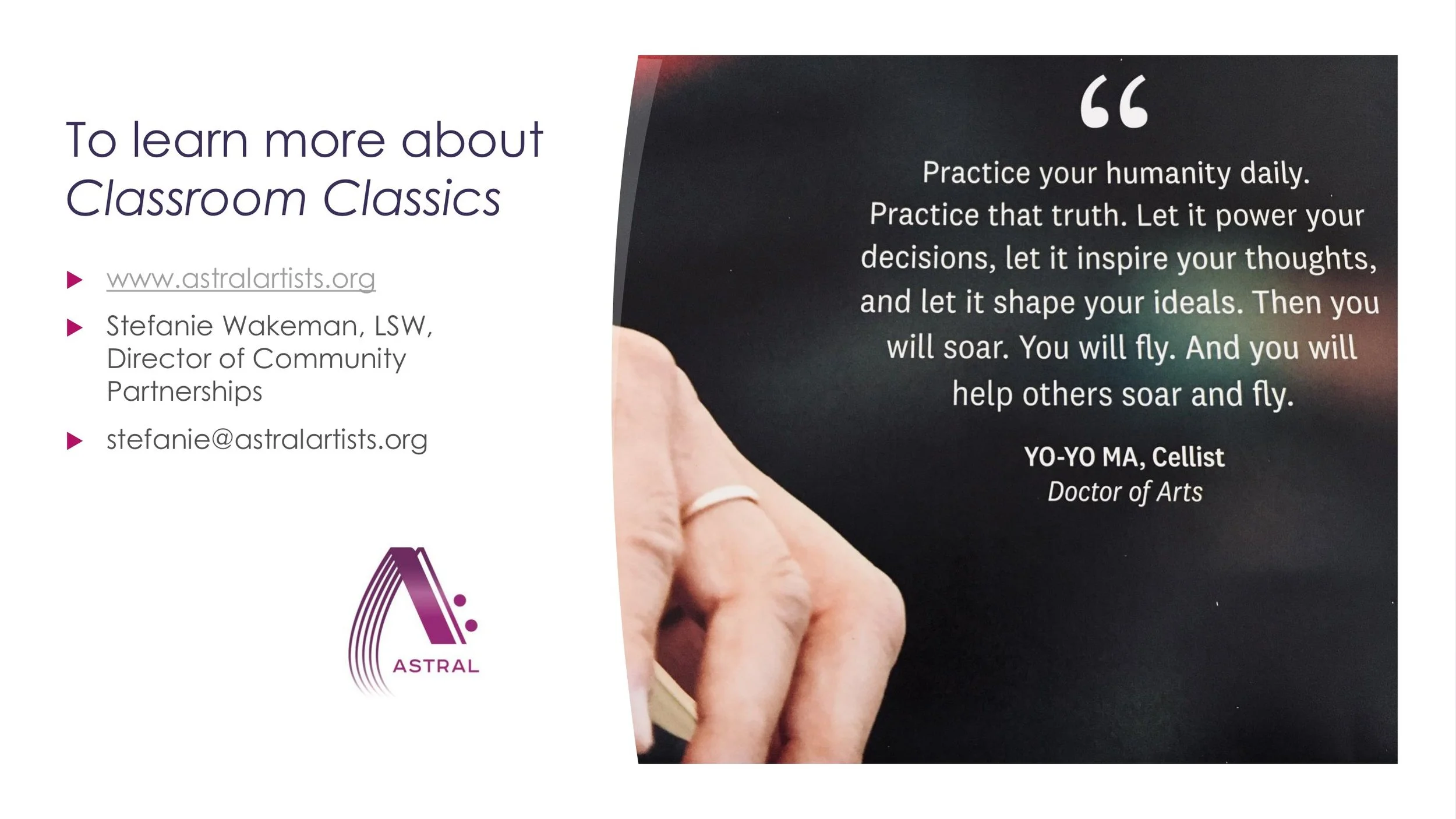 “Classroom Classics, Astral's school-based residency, is centered on a personal experience of classical music for students and musicians to share together. Astral Artists work to translate complex musical and interpersonal skills into language and examples that resonate with students. This translation centers on simplifying, not diluting, understanding of the musical and SEL skills. Astral's approach is centered in curiosity and building connections to music in ways that are authentic and engaging. We are enthusiastic learners and look forward to sharing knowledge and learning together. We are also aware of the systemic biases that impact who is seen in the arts, particularly classical music, and actively work to knock down these "false walls" by amplifying the voices of composers and artists of color, those who identify as female or trans, and those living with disabilities. “