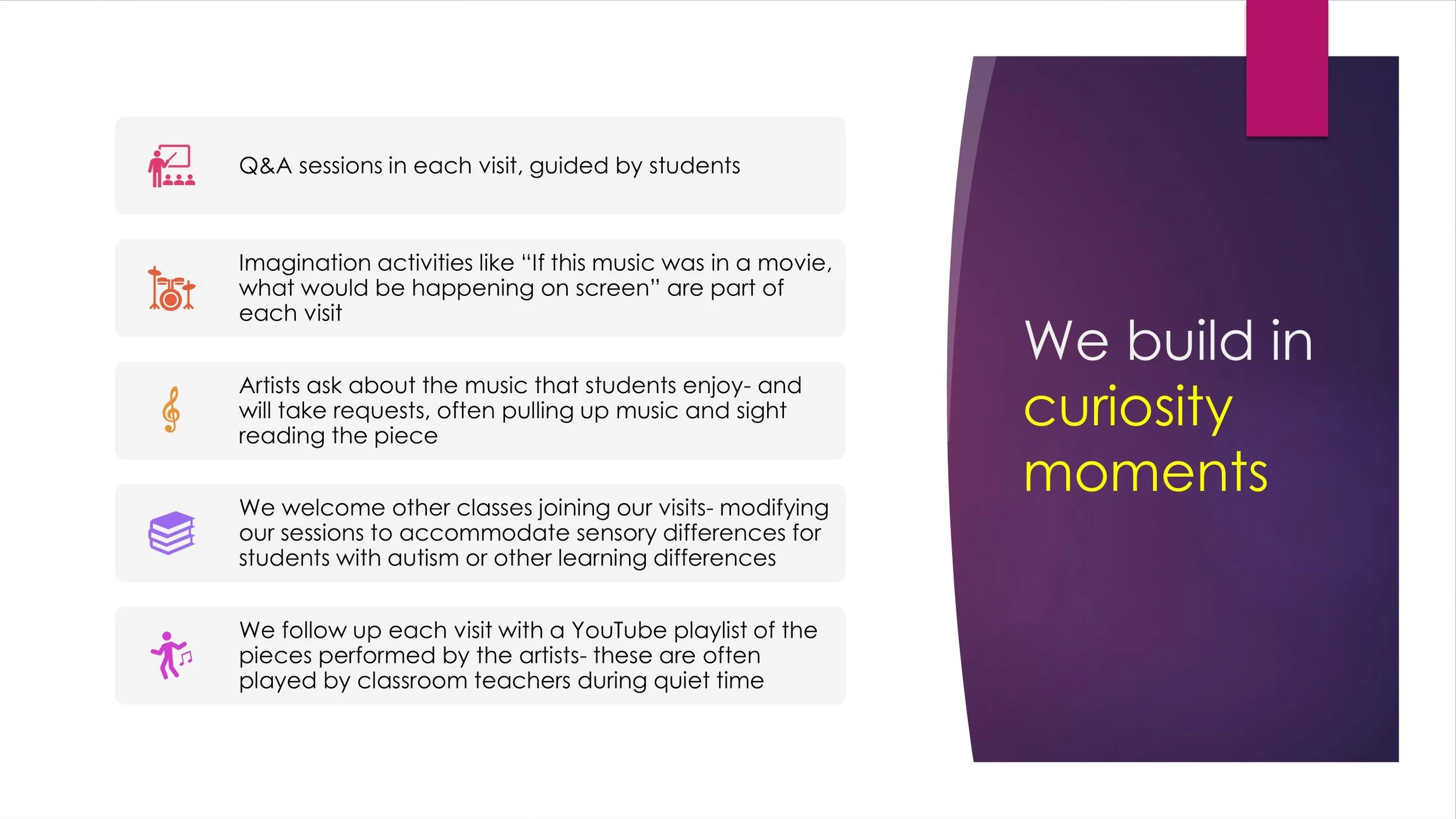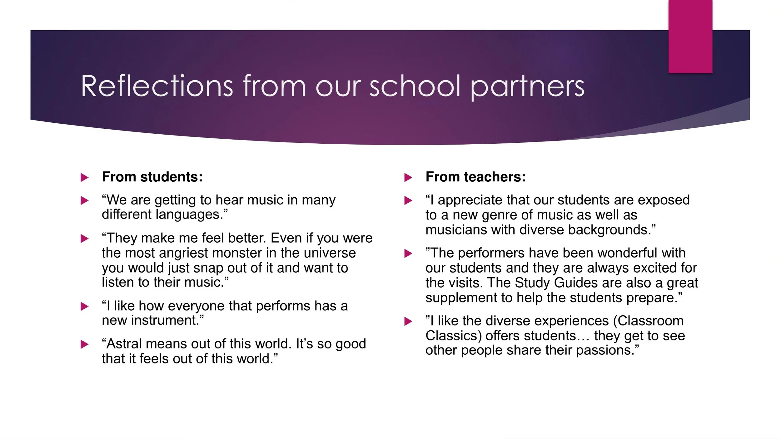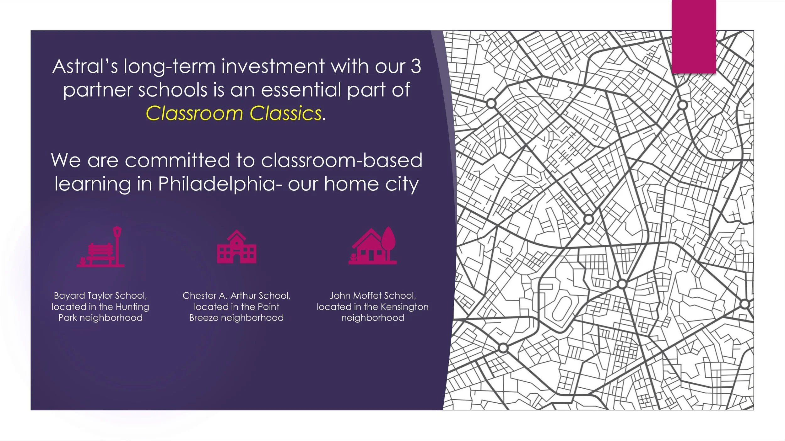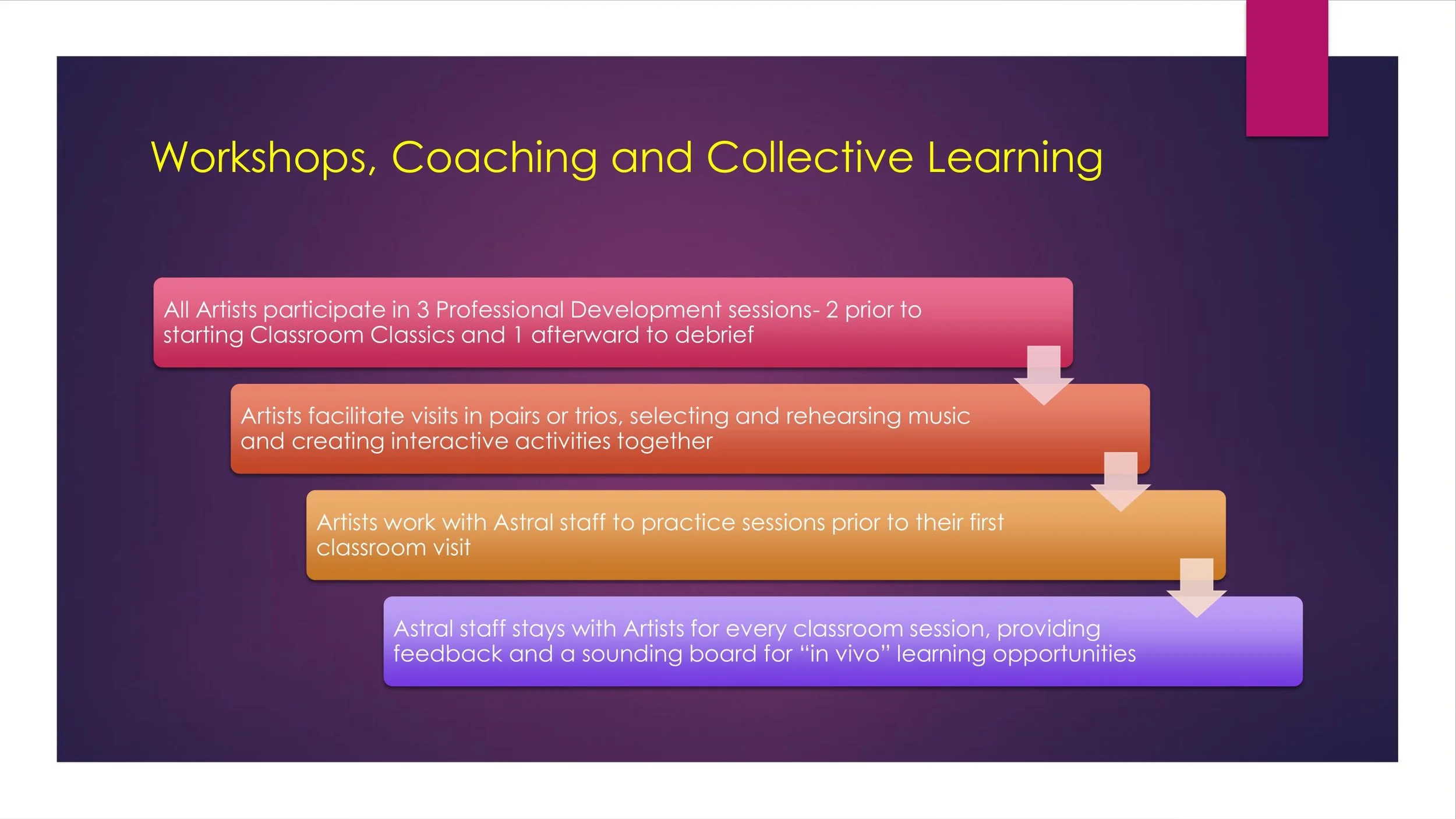 “Classroom Classics, Astral's school-based residency, is centered on a personal experience of classical music for students and musicians to share together. Astral Artists work to translate complex musical and interpersonal skills into language and examples that resonate with students. This translation centers on simplifying, not diluting, understanding of the musical and SEL skills. Astral's approach is centered in curiosity and building connections to music in ways that are authentic and engaging. We are enthusiastic learners and look forward to sharing knowledge and learning together. We are also aware of the systemic biases that impact who is seen in the arts, particularly classical music, and actively work to knock down these "false walls" by amplifying the voices of composers and artists of color, those who identify as female or trans, and those living with disabilities. “